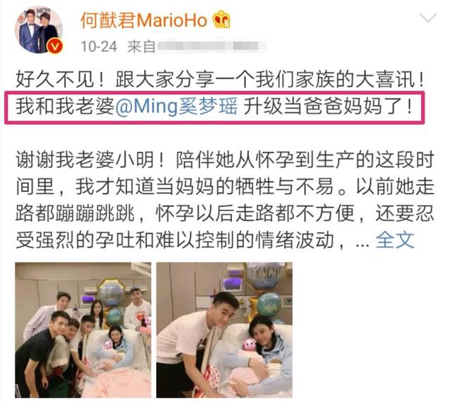 没过多久,奚梦瑶在10月24号喜得贵子,给赌王何鸿燊带来长孙,首次当爹的何猷君喜出望外,当天他就发长文晒合照向大家道喜。可所谓人红是非多,在何猷君与奚梦瑶自谈恋爱到结婚生子以来,他们都时常遭到一些键盘侠网友的恶评,称奚梦瑶与何猷君匆忙结婚生子是为了多分财产。