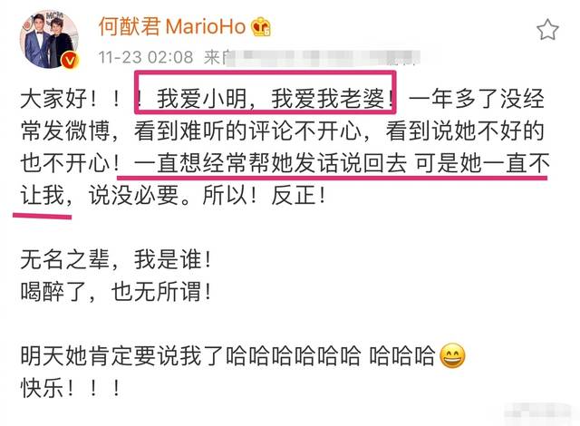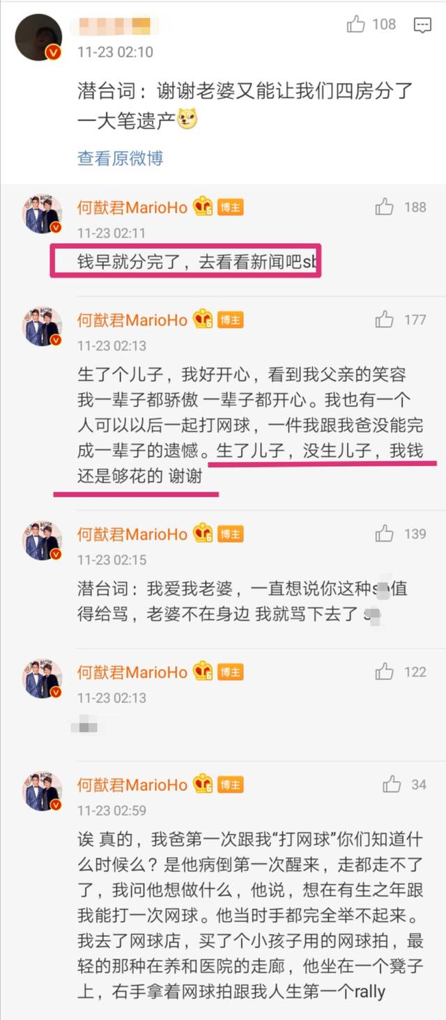 从何猷君深夜发文来看,足见他非常爱自己老婆奚梦瑶,虽然奚是一个明星、当红模特,肯定避免不了一些非议。但作为丈夫的何猷君为老婆讨个不公很正常。何猷君深夜不仅表白老婆,同时回怼个别网友关于娶妻生子是为了多分财产一说法,他直接怒斥某键盘侠的恶评:“钱早就分了,去看看新闻吧”。