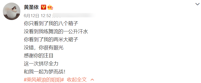 为了给孩子树立一个好榜样,黄圣依做得有多好呢?就连回应各种质疑都显得彬彬有礼,并且热血十足了!比如说外界说黄圣依带了八个箱子来训练,显得非常大牌。但是黄圣依的回答有条有理:“感谢你的瞩目,这一次拼尽全力,和我一起为梦而战。”简单点来说,其他中年女星可能是把《浪姐》当成了二次追梦的舞台,可黄圣依却并非如此,她仅仅只是想要让孩子认识到他的母亲有多努力,通过自己的言行举止,让孩子也变成一个非常优秀的人!所以可以看到黄圣依从来就不会抨击黑粉言论,反而会乐观对待黑粉的言论。