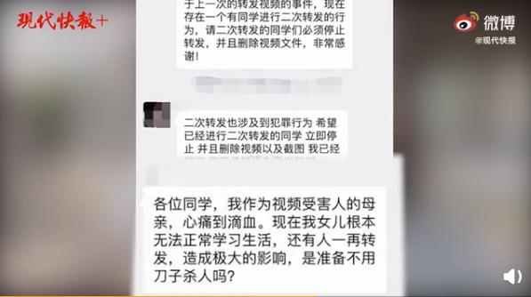 各位同学,我作为视频受害人母亲,心痛到滴血,现在我女儿根本无法正常学习和生活,还有人一再转发,造成极大影响。