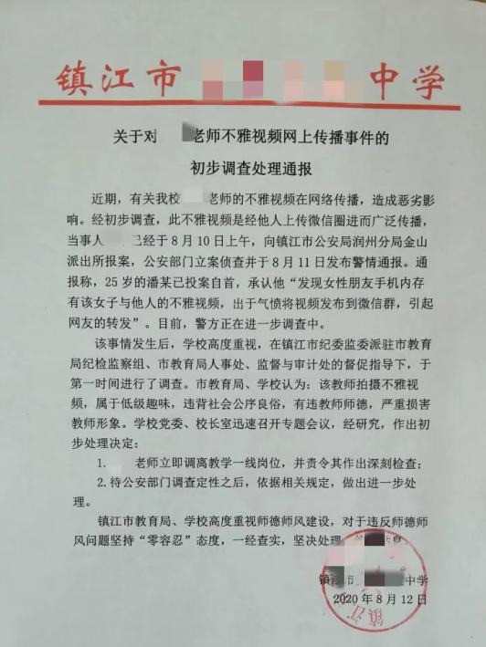 8月12日,涉事校方官方回复,表示康某的不雅视频在网络传播,造成恶劣影响。经初步调查,此不雅视频是经他人上传微信圈进而广泛传播,当事人已经报案。事情发生后,学校高度重视,在镇江市纪委监委派驻市教育局纪检监察组、镇江市教育局人事处和审计处的督促指导下,于第一时间进行了调查。镇江市教育局、学校认为:该教师拍摄不雅视频,属于低级趣味,违背社会公序良俗,有违教师师德,严重损害教师形象。遂作出初步处理决定: