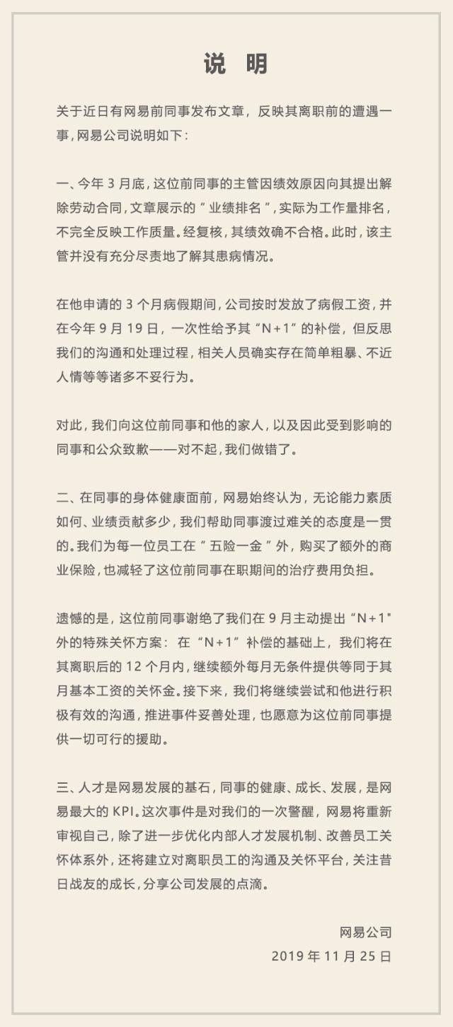 网易表示,“但反思我们的沟通和处理过程,相关人员确实存在简单粗暴、不近人情等等诸多不妥行为。对此,我们向这位前同事和他的家人,以及因此受到影响的同事和公众致歉——对不起,我们做错了。”网易称接下来将继续尝试和这位前同事进行积极有效的沟通,推进事件妥善处理,也愿意为这位前同事提供一切可行的援助。