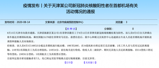 经核查,该人员8月3日18时25分抵达首都机场T3航站楼,19时至20时,在34值机柜台附近星巴克店就餐,2名工作人员与其有过近距离接触;21时有2名国航员工为其办理值机;21时24分,前往海关进行检疫,检疫人员二级防护,期间无其他人员近距离接触,在E14登机口附近等待登机;23时01分登机,3名国航员工为其检票后登机。