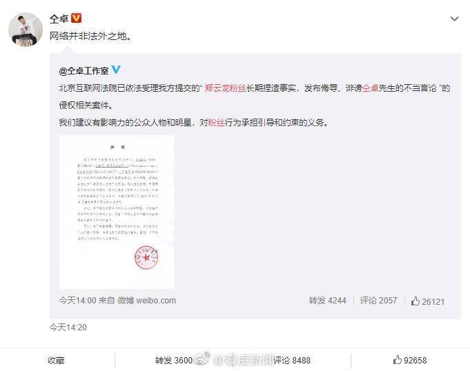 【仝卓工作室起诉郑云龙粉丝仝卓:网络并非法外之地】8月21日,@仝卓工作室 发布声明,称“北京互联网法院已依法受理我方提交的'@郑云龙DL 粉丝长期捏造事实,发布侮辱、诽谤仝卓先生的不当言论'的侵权相关案件。我们建议有影响力的公众人物和明星,对粉丝行为承担引导和约束的义务。”随后@仝卓 转发称:“ 网络并非法外之地。”
