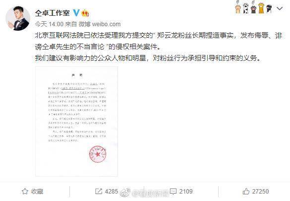 原标题:仝卓工作室起诉郑云龙粉丝 仝卓:网络并非法外之地
