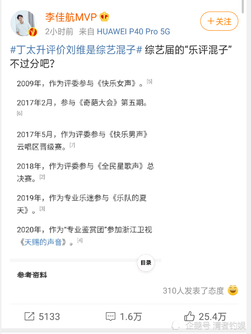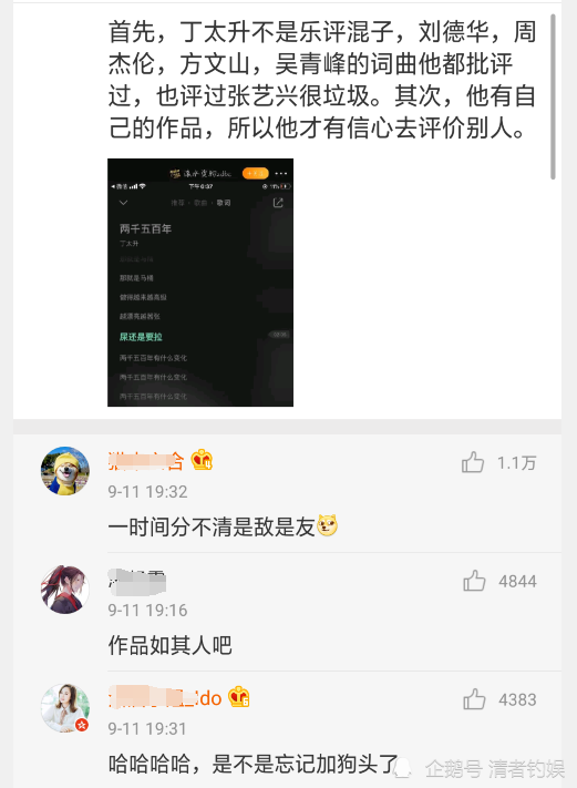 李佳航的配图也很有意思,是丁太昇的百科截图,截图中显示丁太昇当过很多节目的评委以及一些参考资料的截图,总之一看就显得对方很浮躁,对于李佳航的做法,网友们纷纷为他打call,称赞他不愧是“爱情公寓中最有种的男人”!更有人表示:丁太昇批评过周杰伦、刘德华、方文山、吴青峰的词曲,也评论过张艺兴很垃圾,所以是怎样的人很容易看出来,为了表现丁太昇的水准,他还晒出了丁太昇创作的歌词,令人眼界大开,纷纷表示“字如其人”。