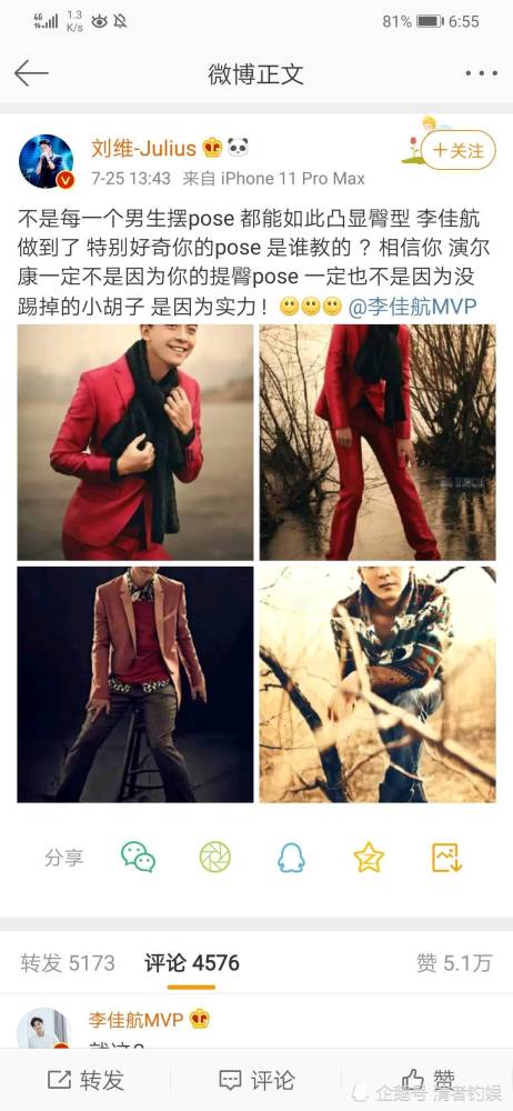 7月25日的时候,刘维还和李佳航有过互动,当时刘维为李佳航的写真大片打call,称他是男生中摆pose最会显身材的人,还夸赞他出演尔康一定是因为实力,其实这里刘维说的话很高明,狠狠的夸张了李佳航的实力和颜值,李佳航和刘维都是鞍山的,关系很不错,所以李佳航此时此刻站出来说话很得体。