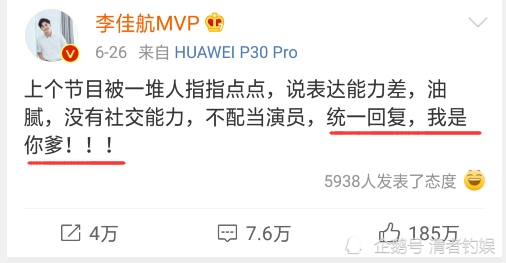 李佳航是一个很憨厚很真性情的人,这一点在他参加的综艺节目《婆婆和妈妈》中就有体现,他真的是一个很好的人,不然他的婆婆也不会如此关怀照顾他,看他和婆婆抓小黑鸡那一集真的笑喷了,他就是个“活宝”,心思敏感但外在大大咧咧,很容易给他人带来欢乐,然而他在节目中最初表现的敏感在当时却遭到了部分网友的群喷,李佳航也不带怕的,直接发文怒怼网友:“说不配当演员,统一回复,我是你爹!”,身为一个敢怼网友的人,怼一个丁太昇,毫不意外。