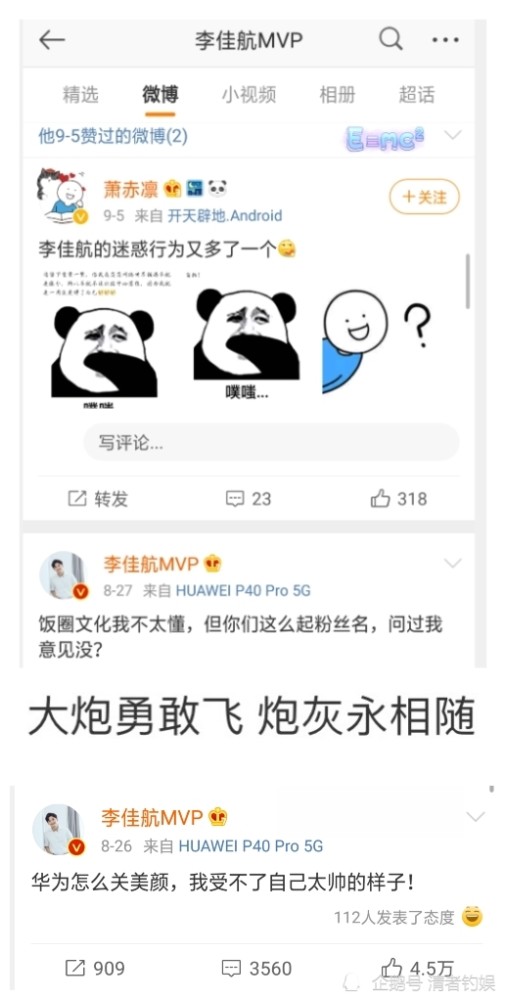 李佳航的日常也很逗,他会点赞cue自己的有趣的博文,还吐槽过自己的粉丝名:“饭圈文化我不太懂,但你们这么起粉丝名,问过我意见没?”在李佳琦的晒图中,可以看到粉丝亲切的喊他“大炮”,自称“炮灰”,想到小说中炮灰的设定,要笑死了!李佳航还自夸过颜值:“华为怎么关美颜,我受不了自己太帅的样子!”