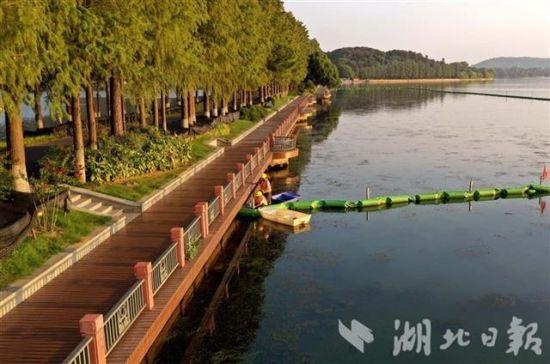 从靠近磨山段的东湖绿道骑行而下,可清晰看到岸边水生植物生长格外茂盛。这就是东湖水生态修复的示范区,也是试验场——郭郑湖鹅咀示范区。