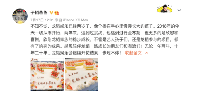 甚至黄子韬爸爸最后一条微博依然是为了儿子的公司,在这一刻看来真的分外引人泪目。在最后一条微博里,黄子韬爸爸晒出蛋糕庆祝公司成立2周年,表示:不知不觉,龙韬娱乐已经两岁了,像个捧在手心里慢慢长大的孩子。2018年的今天一切从零开始,两年来,遇到过挑战,也遇到过行业寒期,但更多的是欣慰和喜悦,欣慰龙韬家族的稳步成长,不管是艺人孩子们,还是龙韬参与的项目,都有了响亮的成果。感恩陪伴龙韬一路成长的朋友们和海浪们!无论一年两年,十年二十年…龙韬娱乐会继续开花结果,步履不停!