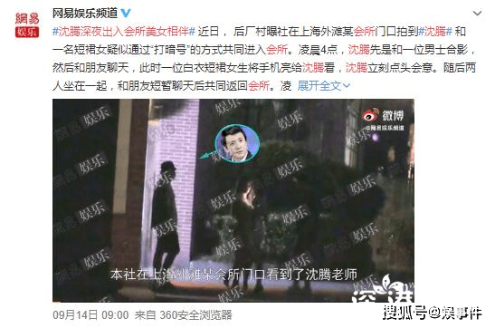 近日, 后厂村曝社在上海外滩某会所门口拍到沈腾和一名短裙女疑似通过“打暗号”的方式共同进入会所。凌晨4点,沈腾先是和一位男士合影,然后和朋友聊天,此时一位白衣短裙女生将手机亮给沈腾看,沈腾立刻点头会意。随后两人坐在一起,和朋友短暂聊天后共同返回会所。凌晨6点多,沈腾从会所出来,并两次检查自己的衣服,似乎是怕蹭上了什么东西,确认无误后,沈腾坐上商务车扬长而去。