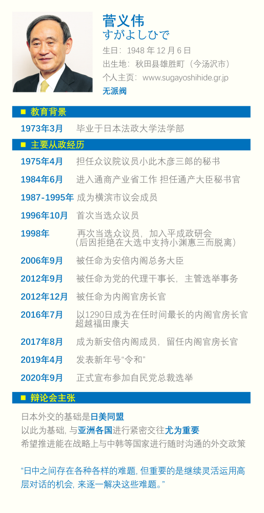 日本如何处理与中国的关系也受到舆论广泛关注。菅义伟之前在辩论会上表示,日本外交的基础是日美同盟,以此为基础,与亚洲各国进行紧密交往尤为重要。菅义伟强调,“日中之间存在各种各样的难题,但重要的是继续灵活运用高层对话的机会,来逐一解决这些难题。”