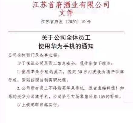 据该文件显示,如使用苹果手机员工,限定30天内更换为国产牌手机,否则按照自动离职处理。所有员工不得购买苹果手机,违者直接辞退,如购买华为手机将给予零售价格15%的补贴。