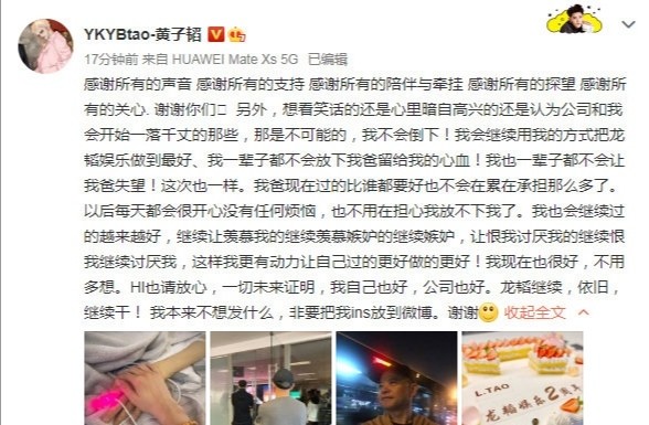 黄子韬发文:我一辈子都不会让我爸失望。我会继续用我的方式把龙韬娱乐做到最好、我一辈子都不会放下我爸留给我的心血!在充满爱的环境里长大的韬,我们相信你一定不会辜负爸爸的心血。你那么善良赤城,未来的路还有我们陪你。你一定一定会做的更好!