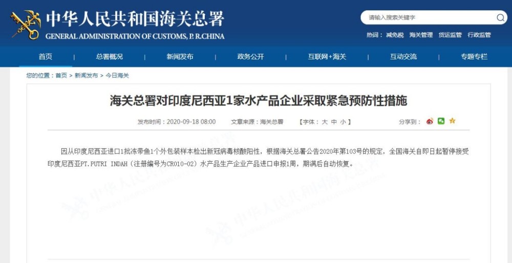 海关总署网站消息,因从印度尼西亚进口1批冻带鱼1个外包装样本检出新冠病毒核酸阳性,根据海关总署公告2020年第103号的规定,全国海关自即日起暂停接受印度尼西亚PT.PUTRI INDAH(注册编号为CR010-02)水产品生产企业产品进口申报1周,期满后自动恢复。