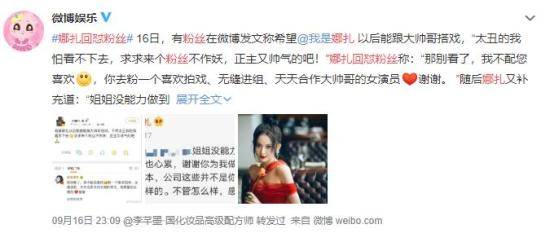 9月16日,据透露,有粉丝在微博发文称希望娜扎以后能跟大帅哥搭戏,“太丑的我怕看不下去,求求来个粉丝不作妖,正主又帅气的吧!”