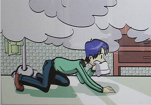 由于火灾烟气具有高温、高毒性、氧气少、一氧化碳多的特点,吸入后容易引起呼吸系统烧伤或神经中枢中毒。因此,在疏散过程中,应使用湿毛巾或手帕捂住口鼻(但毛巾和手帕不应超过六层厚)。注意:请勿顺风撤离,应迅速逃到上风处,以躲避烟火的侵害。由于火灾时上部空间聚集了太多的烟,它向上迅速蔓延,水平蔓延慢。因此,逃生时,不要直立行走,应弯腰或匍匐前进。但如遇石油液化气或城市煤气火灾时,不应采用匍匐前进方式。