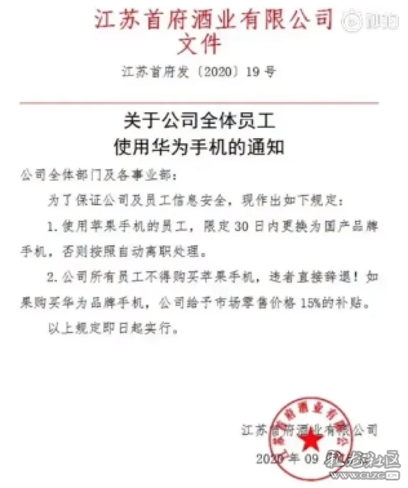 根据媒体报道,9月15日,江苏一酒业公司发布《关于公司全体员工使用华为手机的通知》。曝光文件显示,该通知要求,为了保证公司及员工信息安全,规定使用苹果手机的员工,限定30日内更换为国产品牌手机,否则按照自动离职处理。