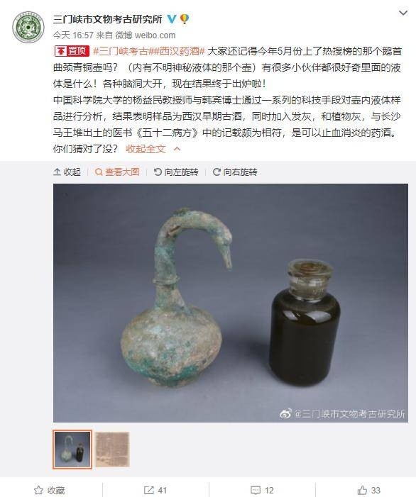从三门峡市文物考古研究所获悉,经中国科学院大学研究人员取样检测,鹅首曲颈青铜壶内的液体为西汉早期的古酒,并与湖南长沙马王堆汉墓出土的医学方书《五十二病方》中的相关记载颇为相符,是可以止血消炎的药酒。