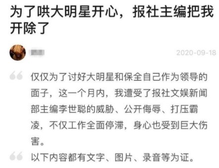 9月18日上午,一位自称某知名报社文娱部电影记者的网友,在社交平台发布了一篇名为《为了哄大明星开心,报社主编把我开除了》的文章,引起了诸多网友的热议。