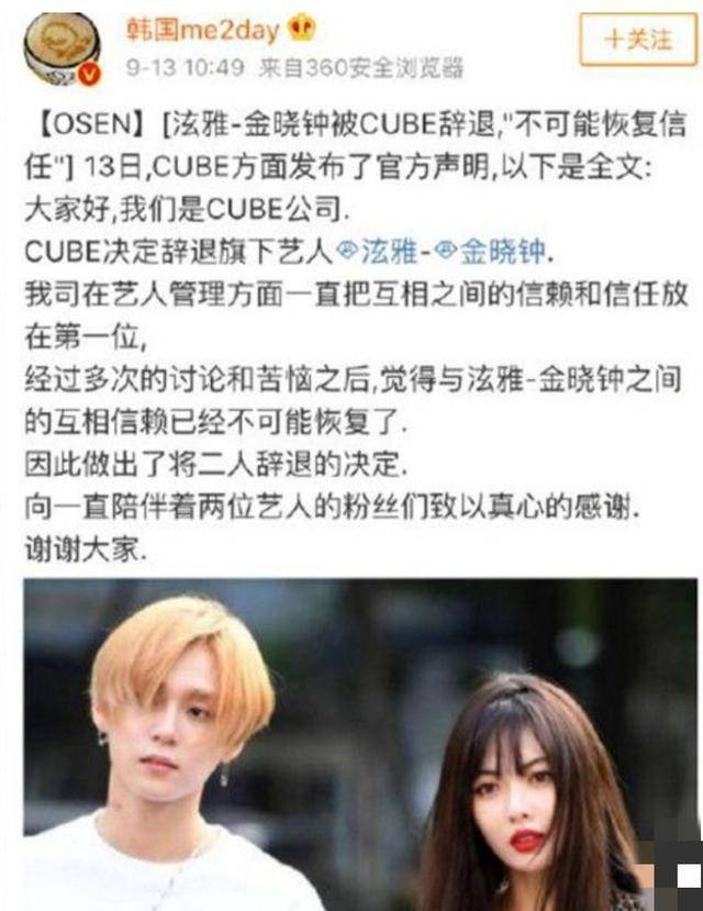2018年8月2日,金泫雅承认了和金晓钟的恋爱关系,希望大家能支持他们的恋情,他们希望大大方方的一起在舞台上表演,两人还是相差2岁的姐弟恋。但是在9月13日,金泫雅和金晓钟所属的公司CUBE宣布将二人同时辞退,因为爱豆在职业上升期谈恋爱是不被允许的,尤其是在韩国。