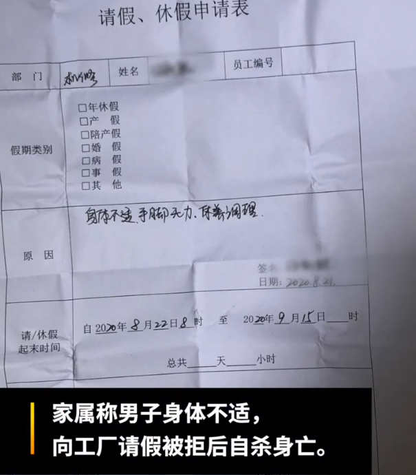 广东一男子身体不舒服向工厂请假,工厂拒绝了请假的诉求,自杀身亡,警方已介入调查。