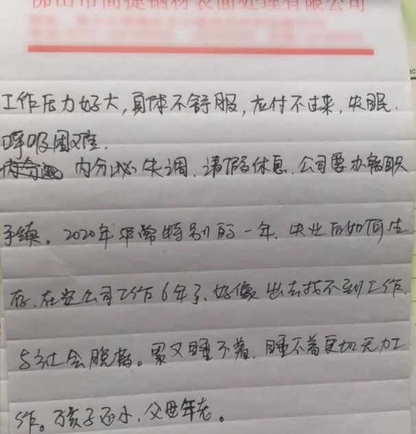 死者留下了一张纸条,写到,自己工作压力好大,身体不舒服想请假休息,公司要办离职手续。在这里工作6年了,与社会脱轨,今年又是特殊的一年,如果失业更找不到工作。每天失眠睡不好,更加无力工作。孩子还小,父母年老。