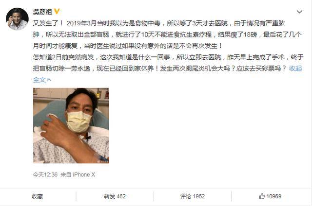 9月19日,吴彦祖发布一条动态,图片是带着口罩的他,仿佛躺在病床。从配文也可以看出,彦祖又一次阑尾炎了。而这次复发让他直接把阑尾割掉了,省得再次犯病。吴彦祖现在就像是一个乖宝宝,任由医生治疗。