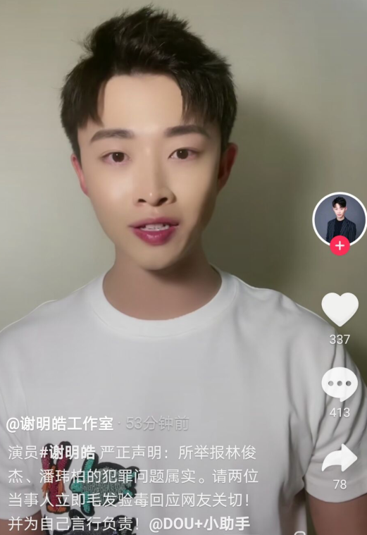 哈喽大家好,我是演员谢明皓,八月二日我发布了潘玮柏林俊杰吸毒犯罪的举报,经过了一天的发酵呢,仍然有很多网友,粉丝,记者朋友们问我真相到底是什么,在这里我首先严正声明,事情的真相就是我所举报的那样,虽然林俊杰和潘玮柏用资本的力量封禁了我相关平台的账号,但是我依然不会就此妥协,虽然他们躲在后面发发律师函,利用自己粉丝基数强大来掩盖自己的犯罪经历,但是依然不能阻碍真相浮出水面,在这里我强烈要求大家和我一起,让林俊杰和潘玮柏马上毛发验毒出具真相报告给大家,不能他躲在后面发发律师函,利用粉丝基数,给自己打打掩护,事情就这么过去了,如果他们没有问题的话,我为我说过的话,负法律责任,希望大家可以理智对待,我真的不想成为下一个肖战,其实你们不知道的是,不管林俊杰有吸毒犯罪等我之前说的那些经历,其实林俊杰还是个男女通吃的人!
