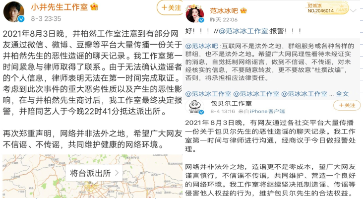 面对此事各位明星纷纷报警,如包贝尔、井柏然等,范冰冰则是发文斥责。