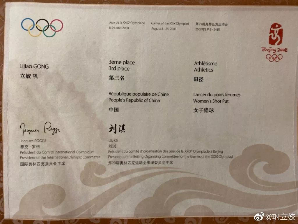 昨天,国际奥委会委员、昔日羽毛球女皇李玲蔚亲自为巩立姣补发奖牌。巩立姣也在社交媒体上留言道:“正义和公平也许会迟到,但从未缺席,北京奥运会第三名!好运,梦想一直在路上!”