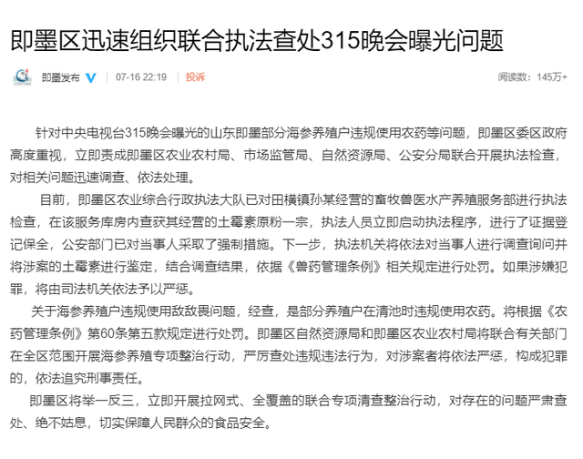 7月16日晚,中央电视台“315”晚会曝光即墨海参养殖违规使用敌敌畏等禁用药物事件,即墨区迅速组织联合执法查处315晚会曝光问题。青岛市委市政府高度重视,迅即做出安排,青岛市海洋发展局主要负责人立即带领执法人员赶赴事发地进行调查处理。