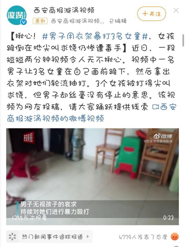 近日, 一段两分钟的短视频引起了广大网友的关注。视频中一名男子让3名女童在自己面前跪下,然后拿出衣架对她们轮流抽打。3个女孩被打得尖叫求饶,但男子却丝毫没有停止的意思。