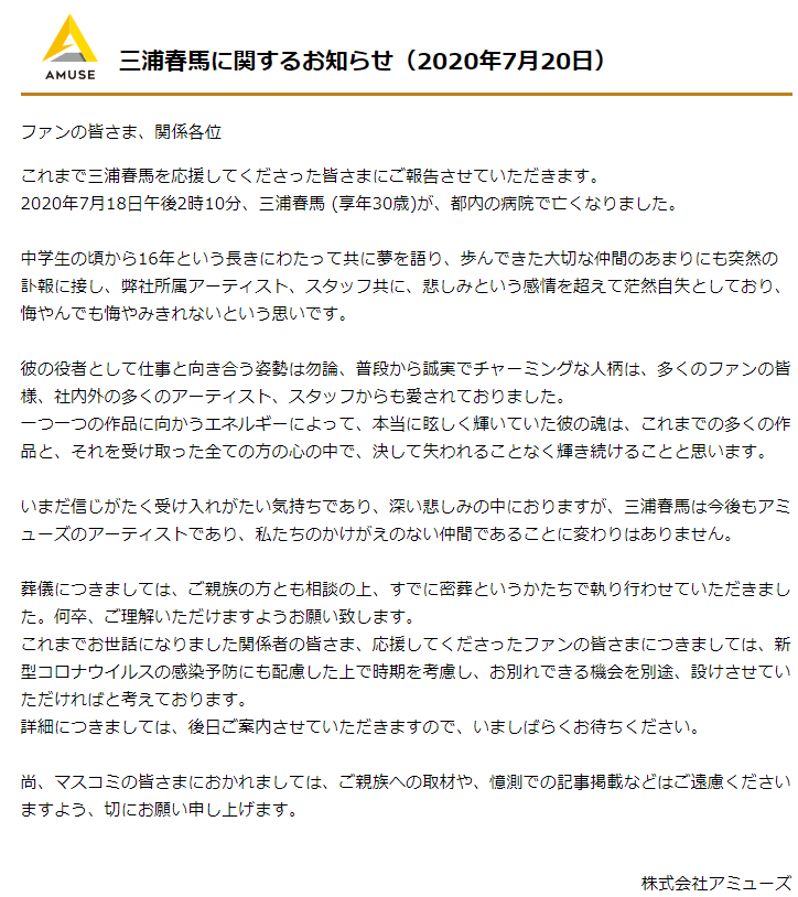 今日,三浦春马的所属公司再次发布了公告,称三浦春马在2020年7月18日下午2:10分于东京一家医院去世。