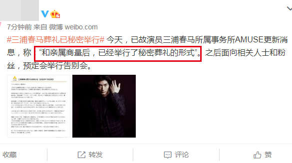 另外,公司透露了一个重要信息,那就是通过咨询三浦春马的亲友得知,葬礼已经被秘密进行完毕,公司希望广大粉丝能够理解。