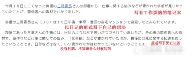 并且日媒还报道了三浦春马的日记,这本日记一度被看成三浦春马的“遗书”的性质,里面有关于工作烦恼、生死观的记录,并且日记的最后还有一个关于死亡记述,据称是“很想死”,但是没有写日期,由此断定三浦春马轻生的念头由来已久。