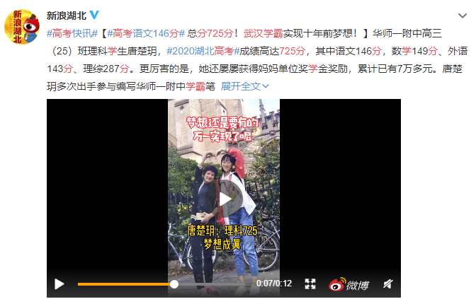 武汉学霸高考725分,作为她的老师表示:孩子有这样的好成绩,自己一点都不意外。这句评价再次证明了武汉学霸的学习能力有多强。