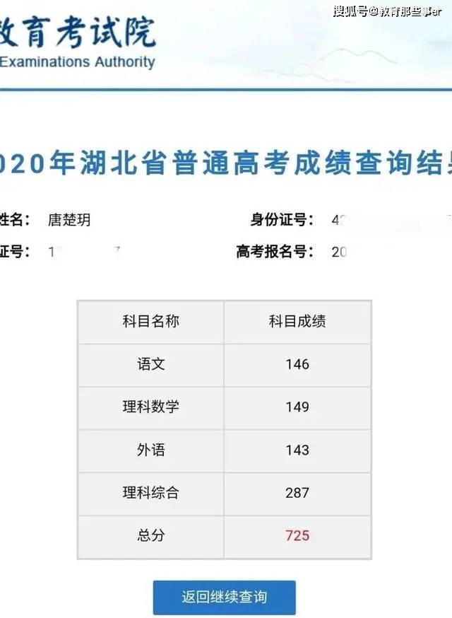 据悉,湖北考生7月22日高考成绩已经发布,不少学校捷报频传。其中,华中师大一附中学生唐楚玥今年高考成绩高达725分,其中语文146分、理科数学149分、外语143分、理综287分,妥妥的坐上了学霸的宝座。小知识:中国历史上比较有名的考神是张镇风和王端鹏。张镇风(1998年全国高考状元)语文:150分英语:150分数学:148分理综:300分总分:748分;王端鹏(2004年山东省高考状元)语文:138分英语:142分数学:149分理综:300分加分:20分总分:749分
