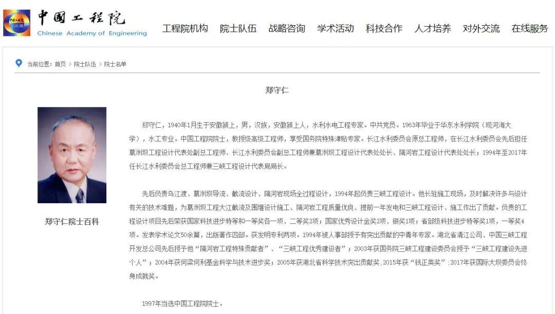 郑守仁,1940年1月生于安徽颍上,男,汉族,安徽颍上人,水利水电工程专家。中共党员。1963年毕业于华东水利学院(现河海大学),水工专业。中国工程院院士,教授级高级工程师,享受国务院特殊津贴专家。长江水利委员会原总工程师,在长江水利委员会先后担任葛洲坝工程设计代表处副总工程师、长江水利委员会副总工程师兼葛洲坝工程设计代表处处长、隔河岩工程设计代表处处长;1994年至2017年任长江水利委员会总工程师兼三峡工程设计代表局局长。