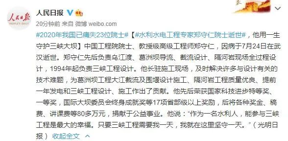 据人民日报、光明日报等媒体报道,中国工程院院士、教授级高级工程师郑守仁,因病于7月24日在武汉逝世。