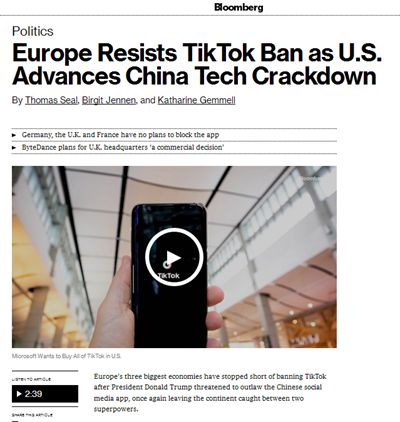 报道说,英国和法国政府发言人表示,两国没有要在本国封禁TikTok的计划。此外,一名德国政府官员也表示,德国还未发现该应用(指TikTok)会带来安全风险的迹象,也没有禁用计划。英国首相约翰逊的发言人还表示,约翰逊还没有和特朗普谈过这个问题。